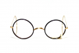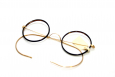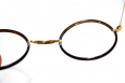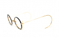 Solid 545 gold 13k eyeglasses, antique from around the 1900's, never used, in new old stock condition. This frame has round lenses, a windsor bridge, and thin cable end temple arms. The lens holders have a celluloid cover in very dark brown color, looking like black. The frame looks handmade and stunningly well finished. It is extremely rare to find an original frame of this quality.