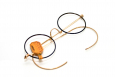 This frame has round lenses, a windsor bridge, and thin cable end temple arms. The lens holders have a celluloid cover in very dark black color.