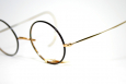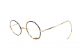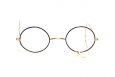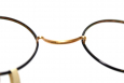 This frame has round lenses, a windsor bridge, and thin cable end temple arms. The lens holders have a celluloid cover in very dark burgundy brown color.