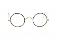 This frame has round lenses, a windsor bridge, and thin cable end temple arms. The lens holders have a celluloid cover in black color.