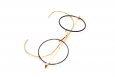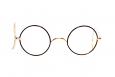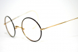 This frame has round lenses, a windsor bridge, and thin cable end temple arms. The lens holders have a celluloid cover in very dark burgundy brown color.